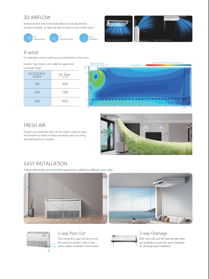 Auto Rsstart Function 2-Way Draining Auto Defrosting Independent Dehumidpcation Anti-cold Air Function 360ْ Air Flow Panel Sleep Mode Timer Low Ambient Cooling Healthy Filters Fresh Air Build-in Drain Pump Wired Control